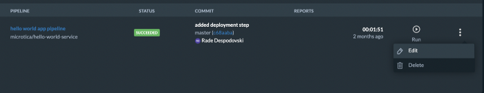 Looking in the Pipelines list, you should see the new build. Clicking on it, you will see the build’s details, along with the pipeline steps and logs for each of them.